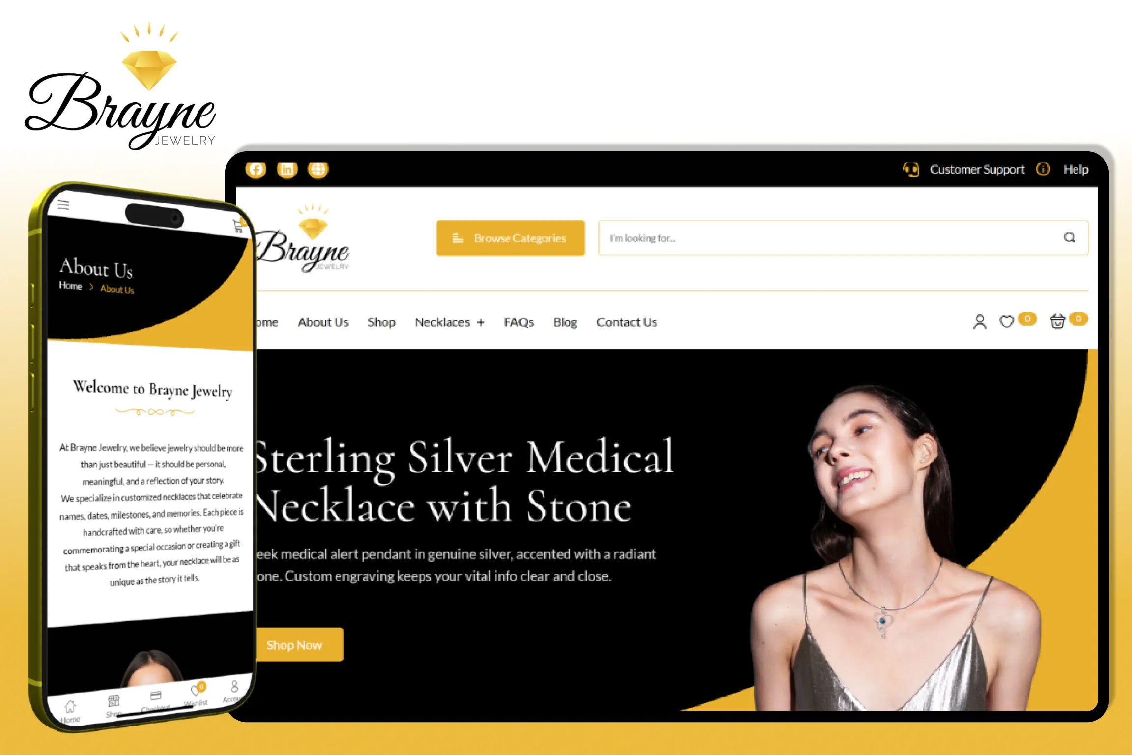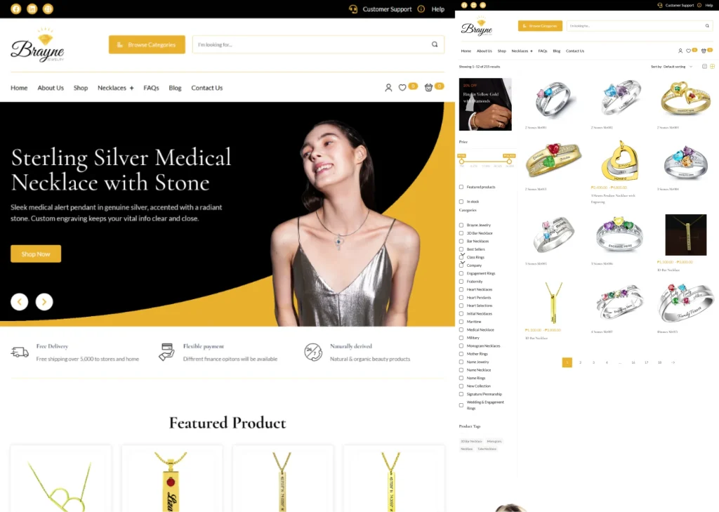 The Brayne Jewelry website was developed as a full ecommerce platform where customers can explore a wide range of customizable jewelry, including name necklaces, rings, and engraved pieces. The platform highlights the emotional value of jewelry by focusing on personalization, storytelling, and meaningful design.
