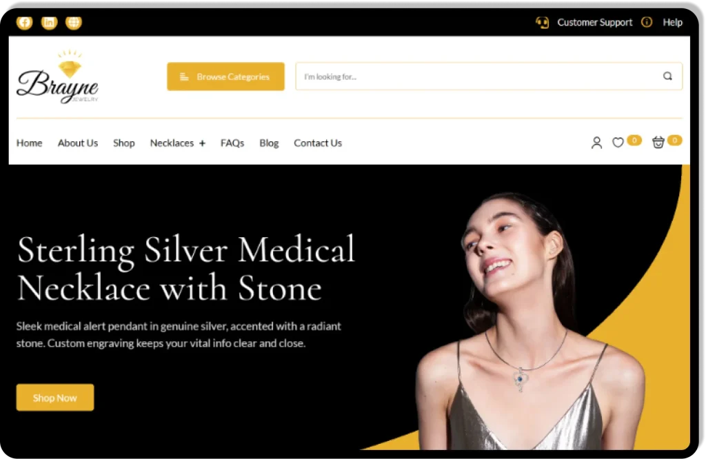 Brayne Digital handled the complete development of the Brayne Jewelry ecommerce website, building a modern online store that showcases personalized jewelry collections and allows customers to customize and order products بسهولة. The project focused on creating a visually appealing product catalog, improving user experience, and delivering a seamless shopping journey.