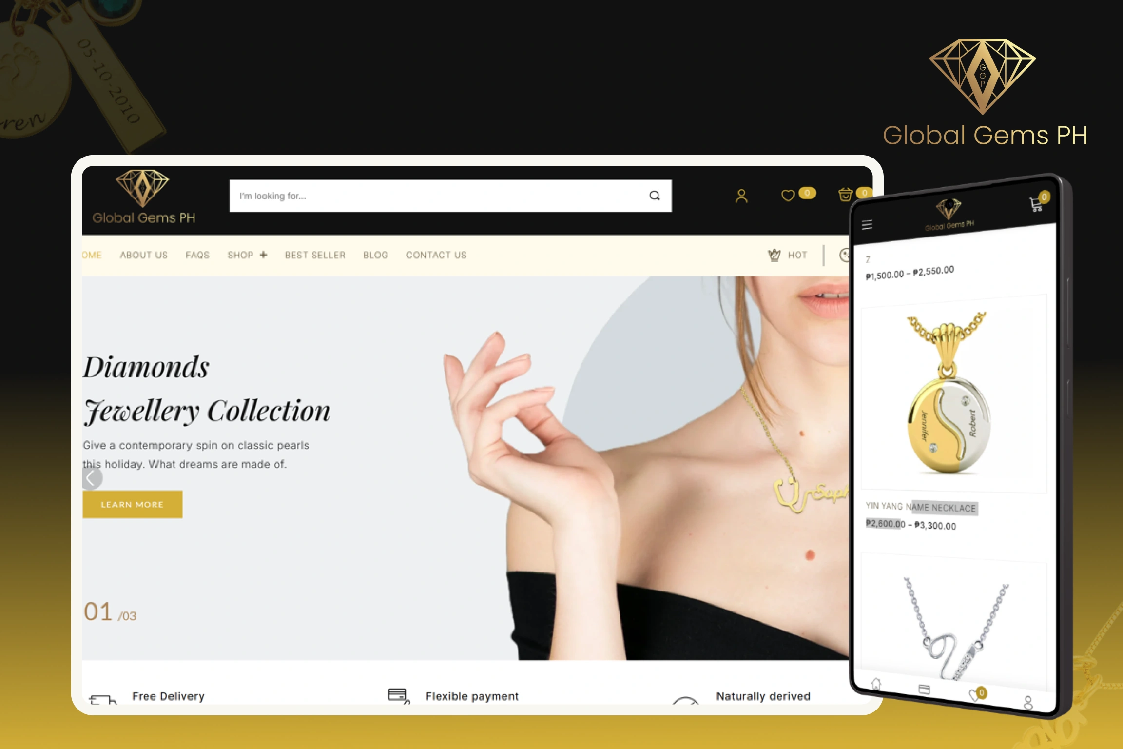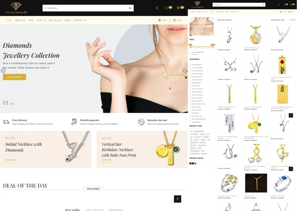 The Global Gems PH website was created as a full ecommerce platform designed to showcase personalized jewelry collections such as name necklaces, rings, and customized pendants. Customers can explore various product categories and choose from multiple customization options to create unique jewelry pieces.