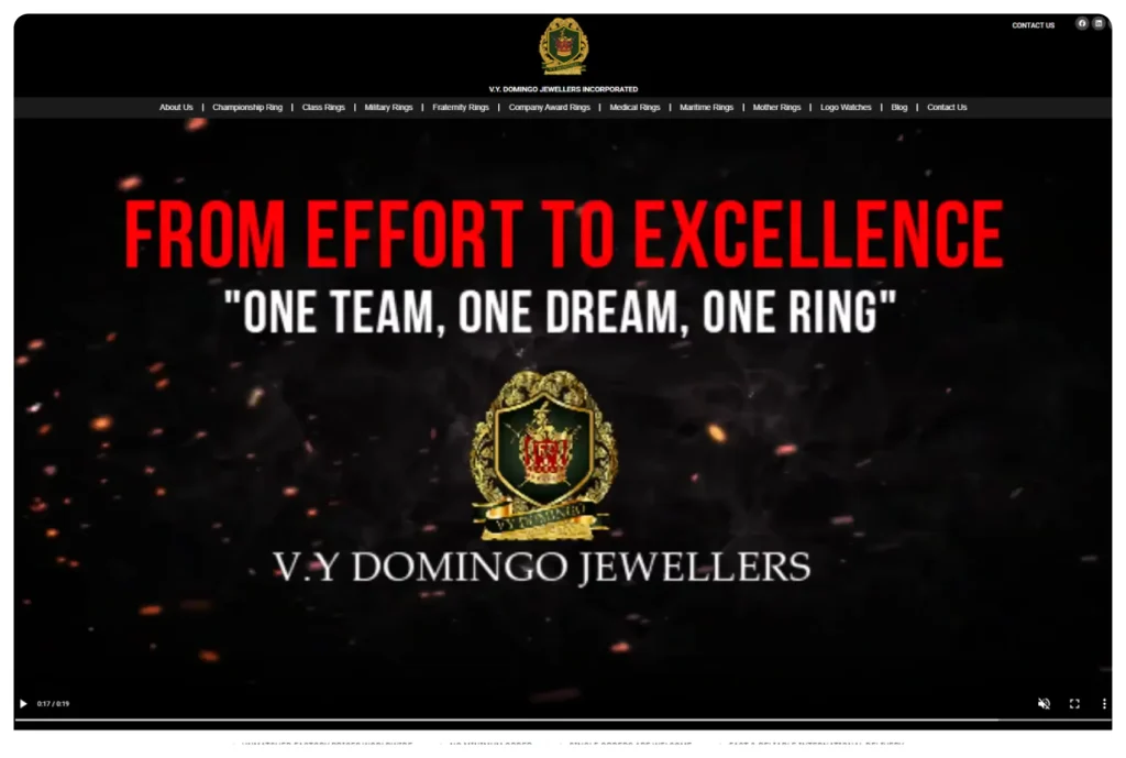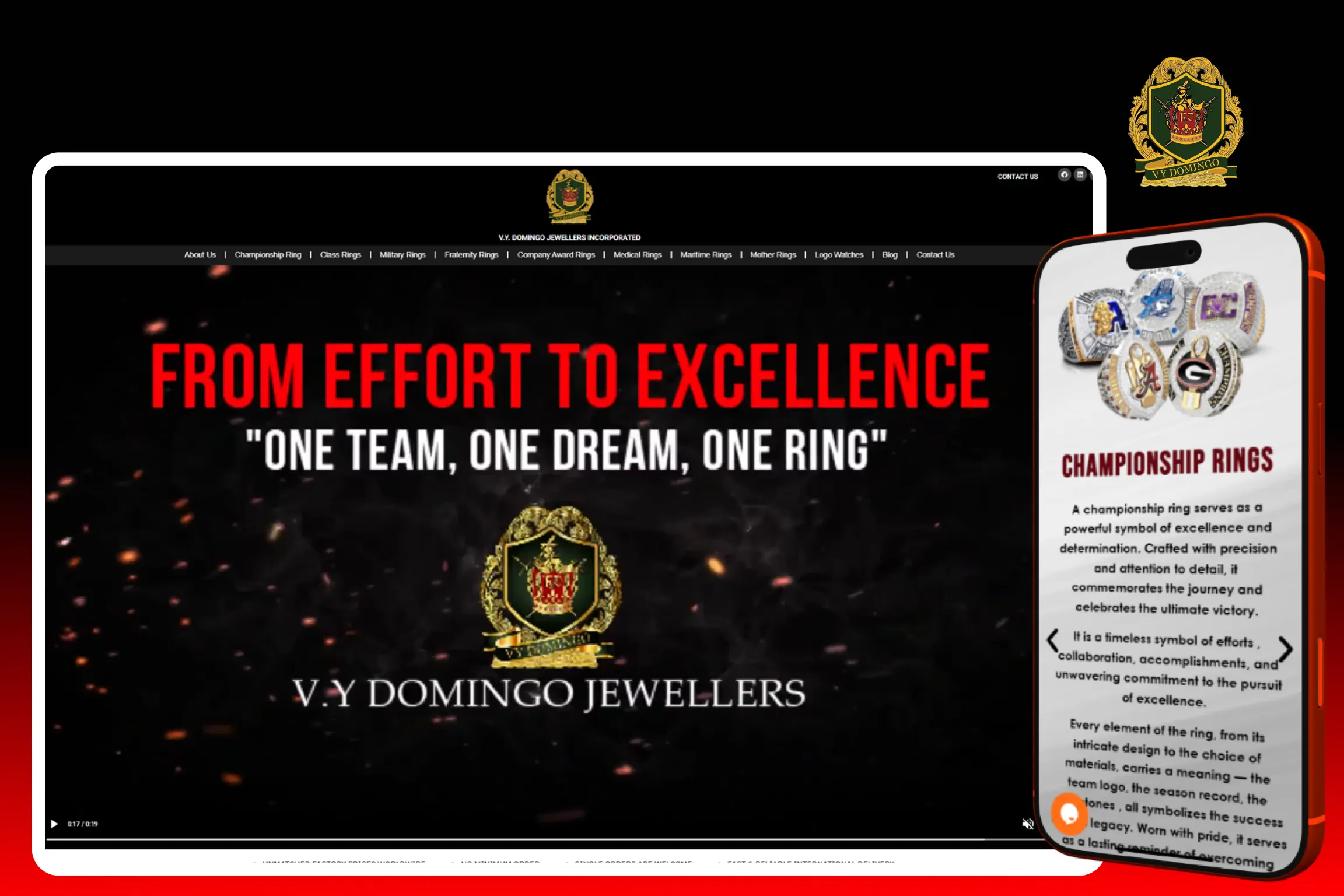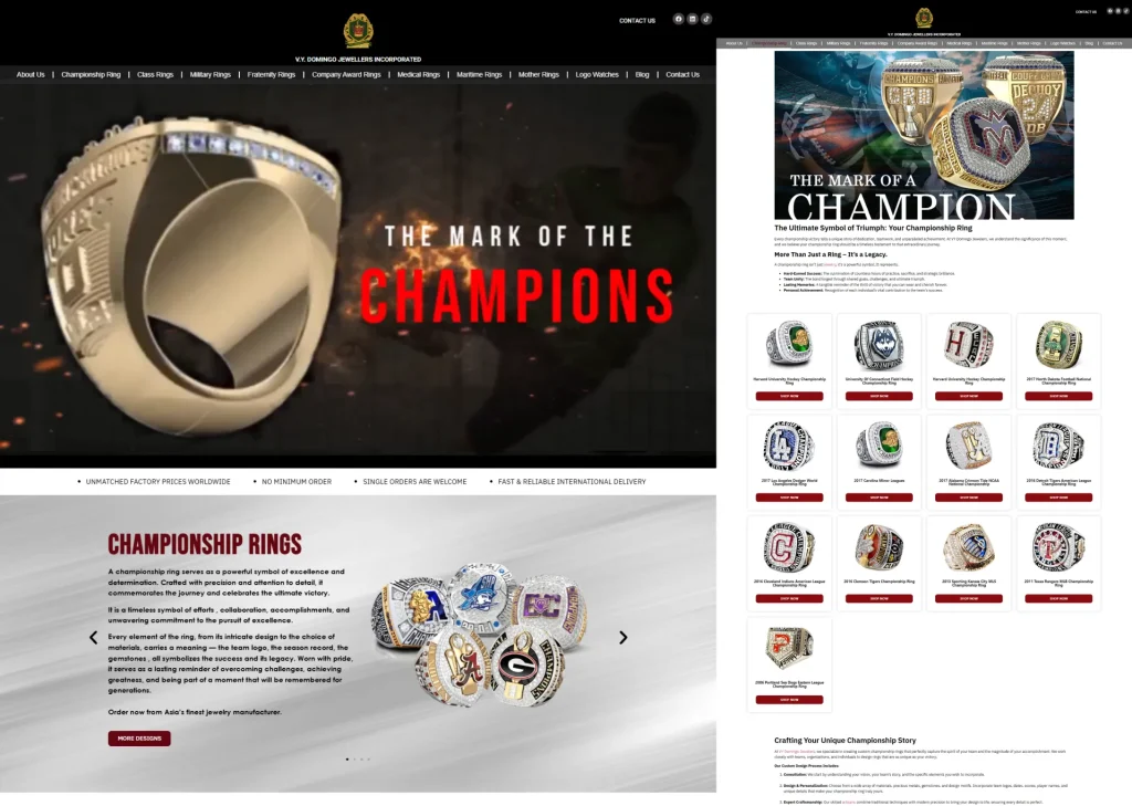 The V.Y. Domingo website was designed to serve as a digital showroom and ecommerce platform for custom jewelry products. The platform highlights various categories such as championship rings, class rings, fraternity rings, and corporate award rings, allowing customers to explore designs and request custom pieces.